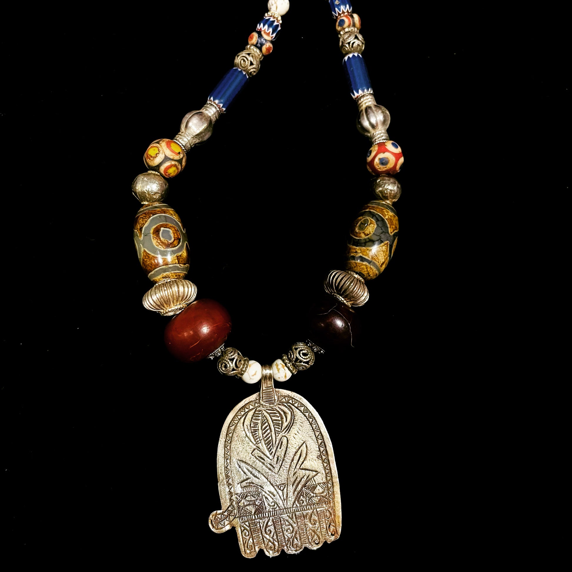 A gorgeous old silver Khamsa pendant strung with carved agate beads, old phenolic resin beads. Recent chevrons, old silver and old trade beads.