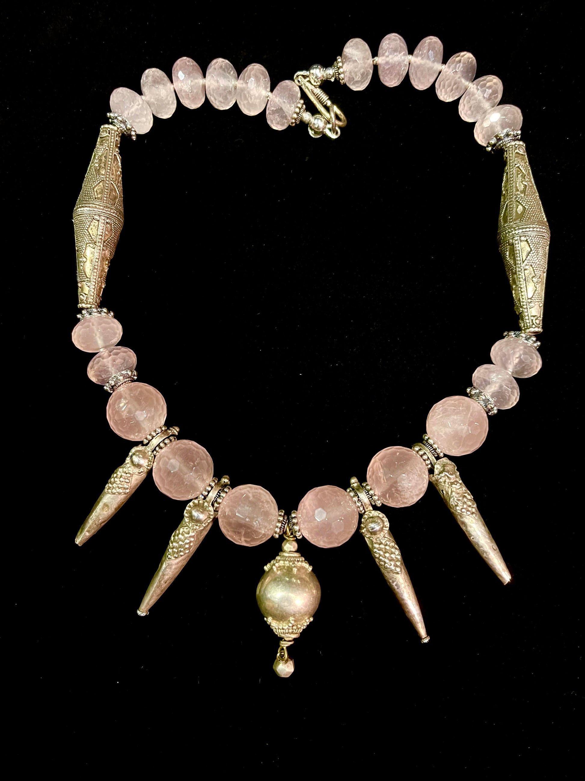 Rose quartz and old silver turkoman bicone beads and pendants and an old silver bead from Sri Lanka.