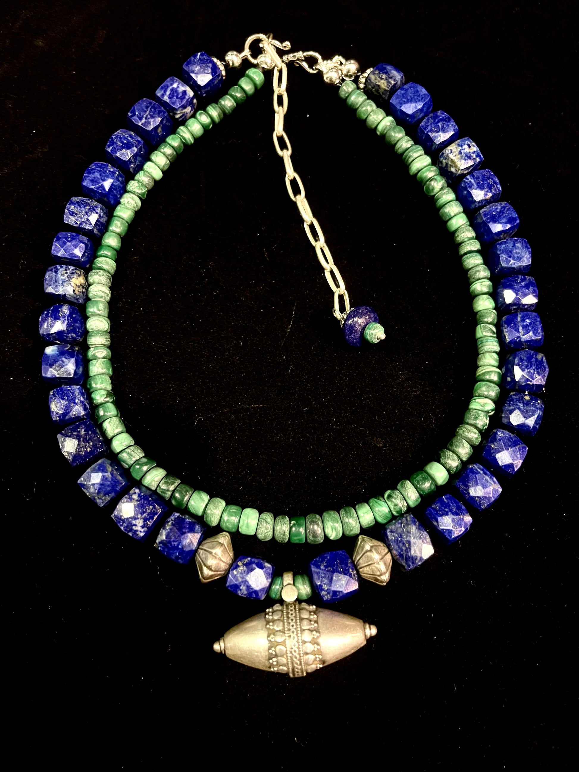 Silver amulet from Rajasthan, strung with Faceted Lapis lazuli, malachite and silver