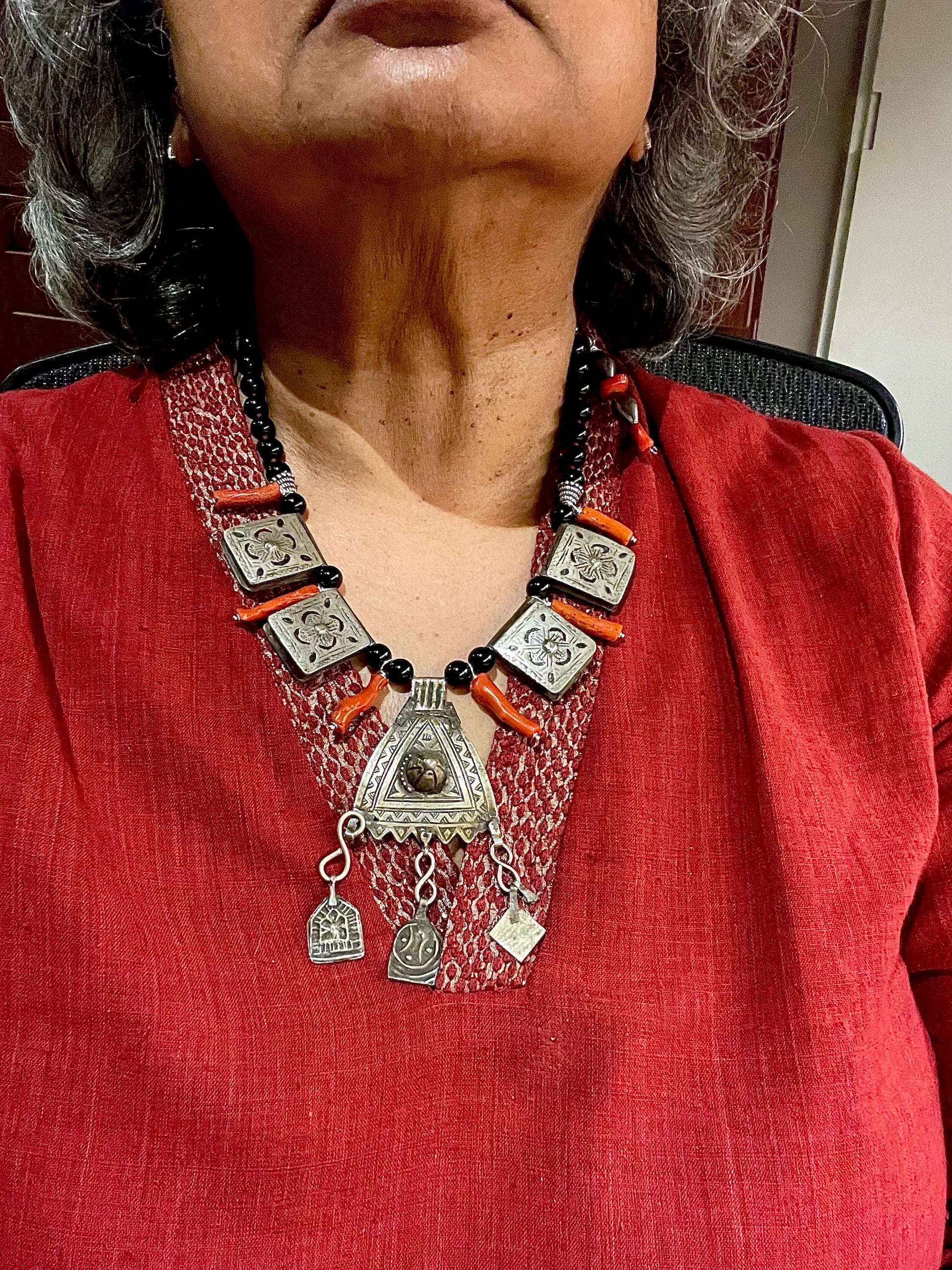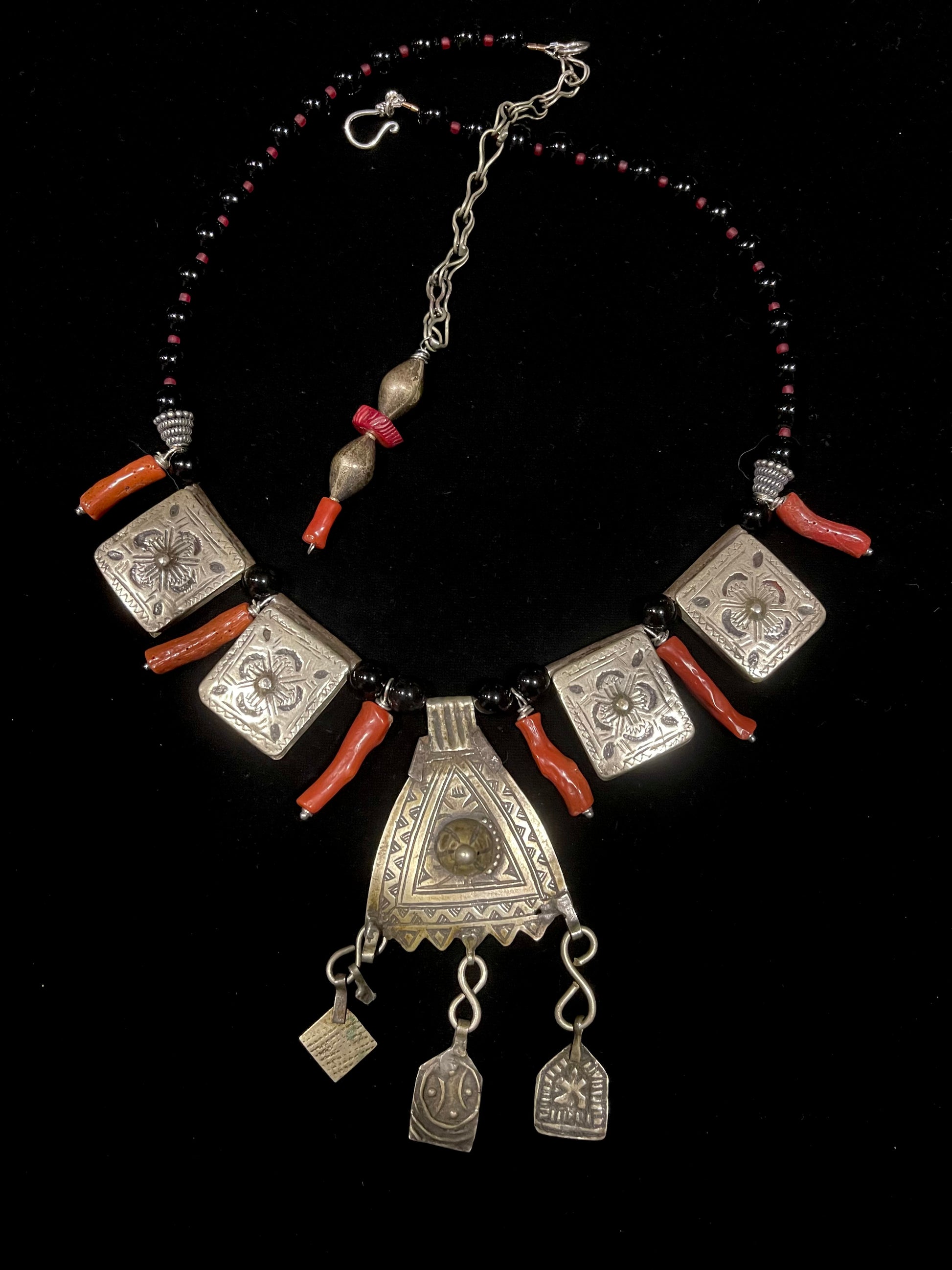 Vintage silver and copper Tuareg pendants strung with Mediterranean coral, old silver and onyx
