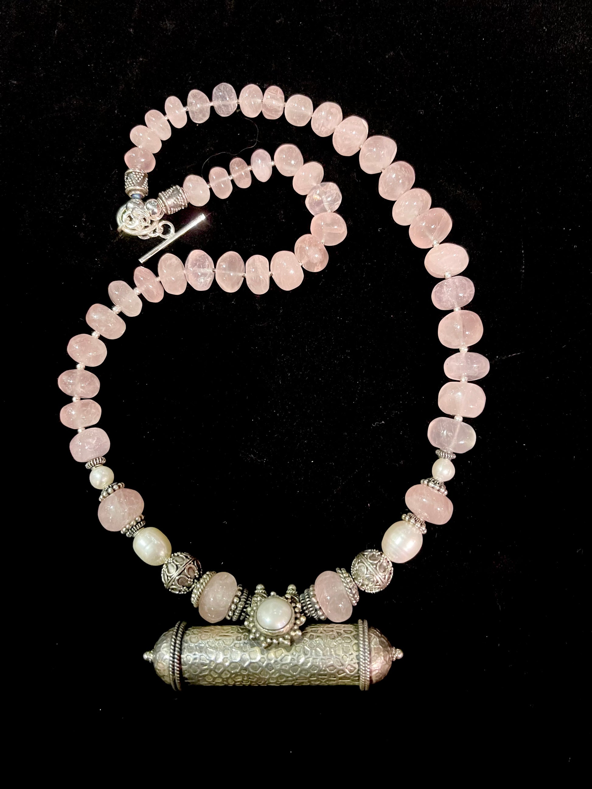 Strung with freshwater pearls and Rose quartz