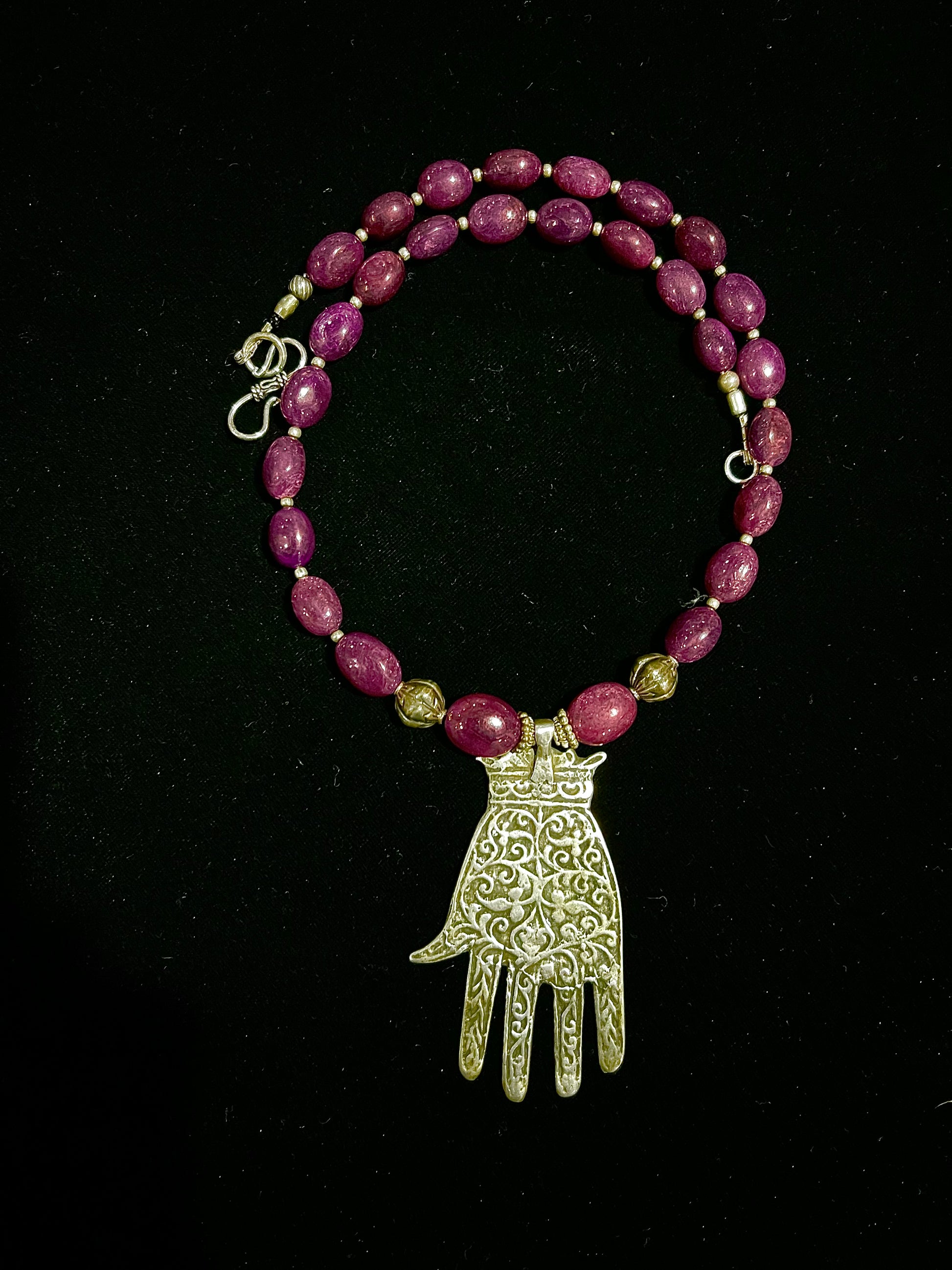 Antique silver Khamsa pendant from Morocco with A grade Ruby beads and silver