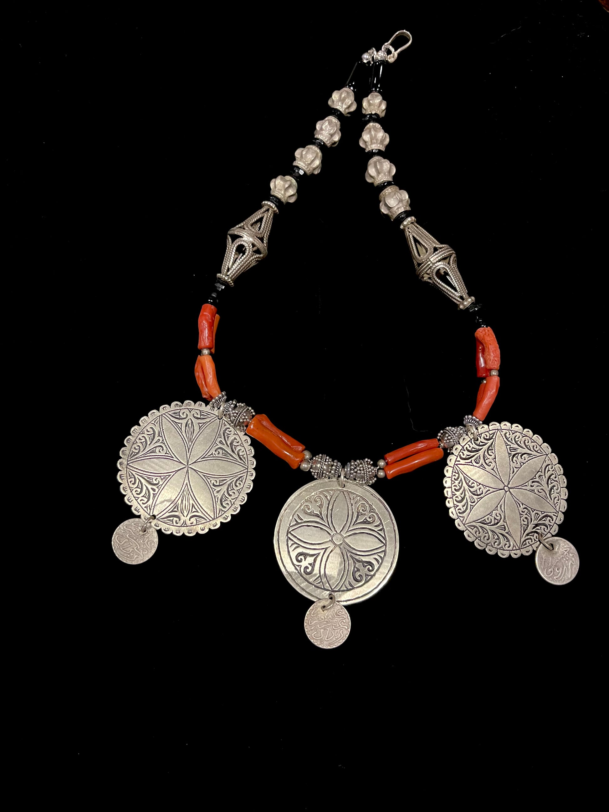 Three Silver recent production pedants from Morocco, strung with branch coral and old silver