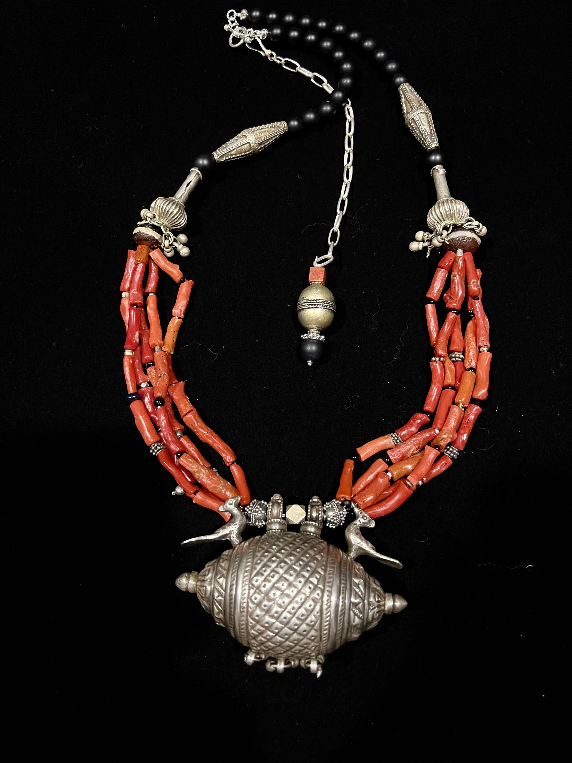 Vintage Silver amulet from Gujarat featuring 2 peacocks . Strung with Mediterranean coral, old Indian silver and Matte black agates