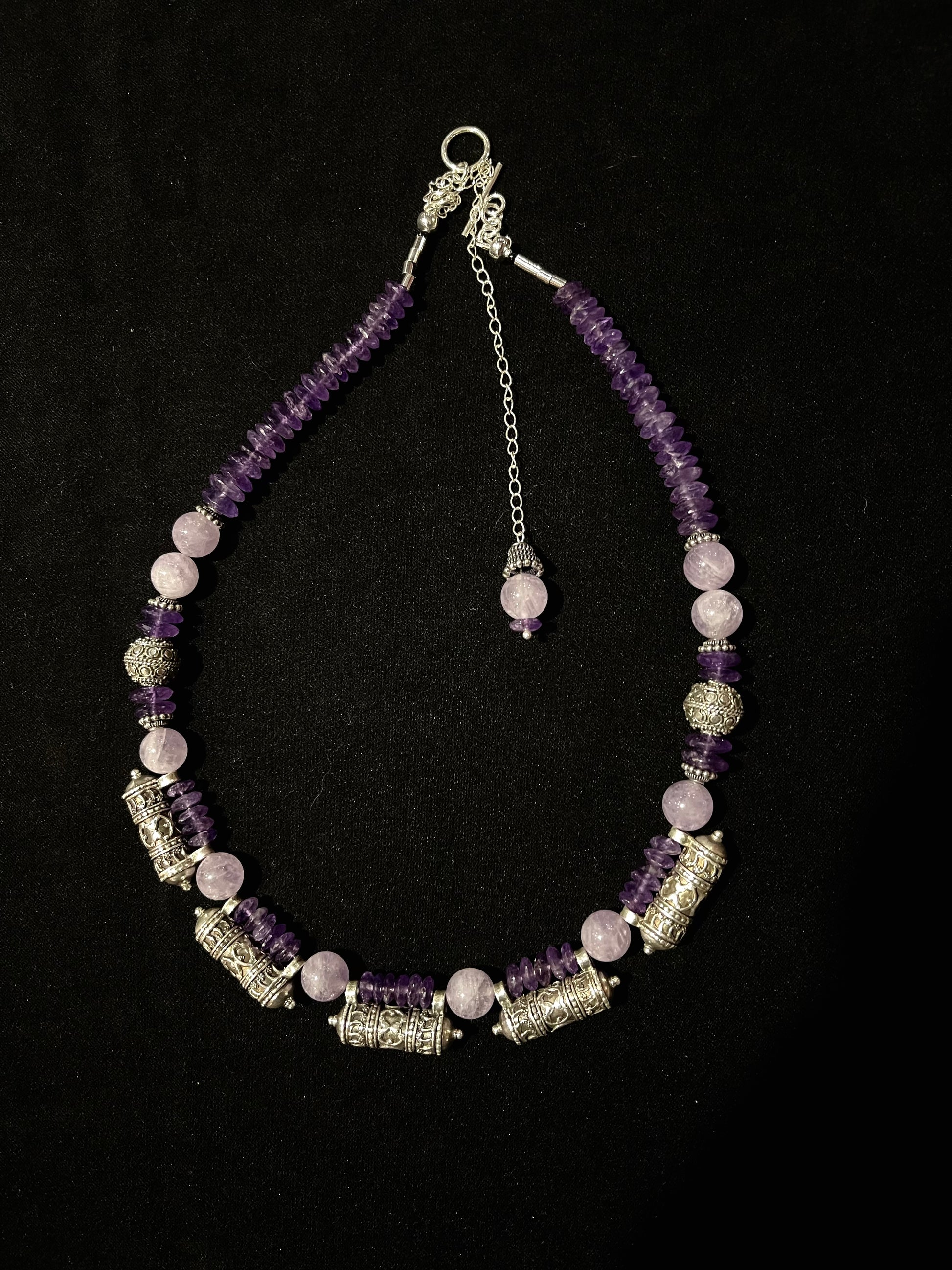 5 small silver Sri Lankan amulets strung with amethyst and silver