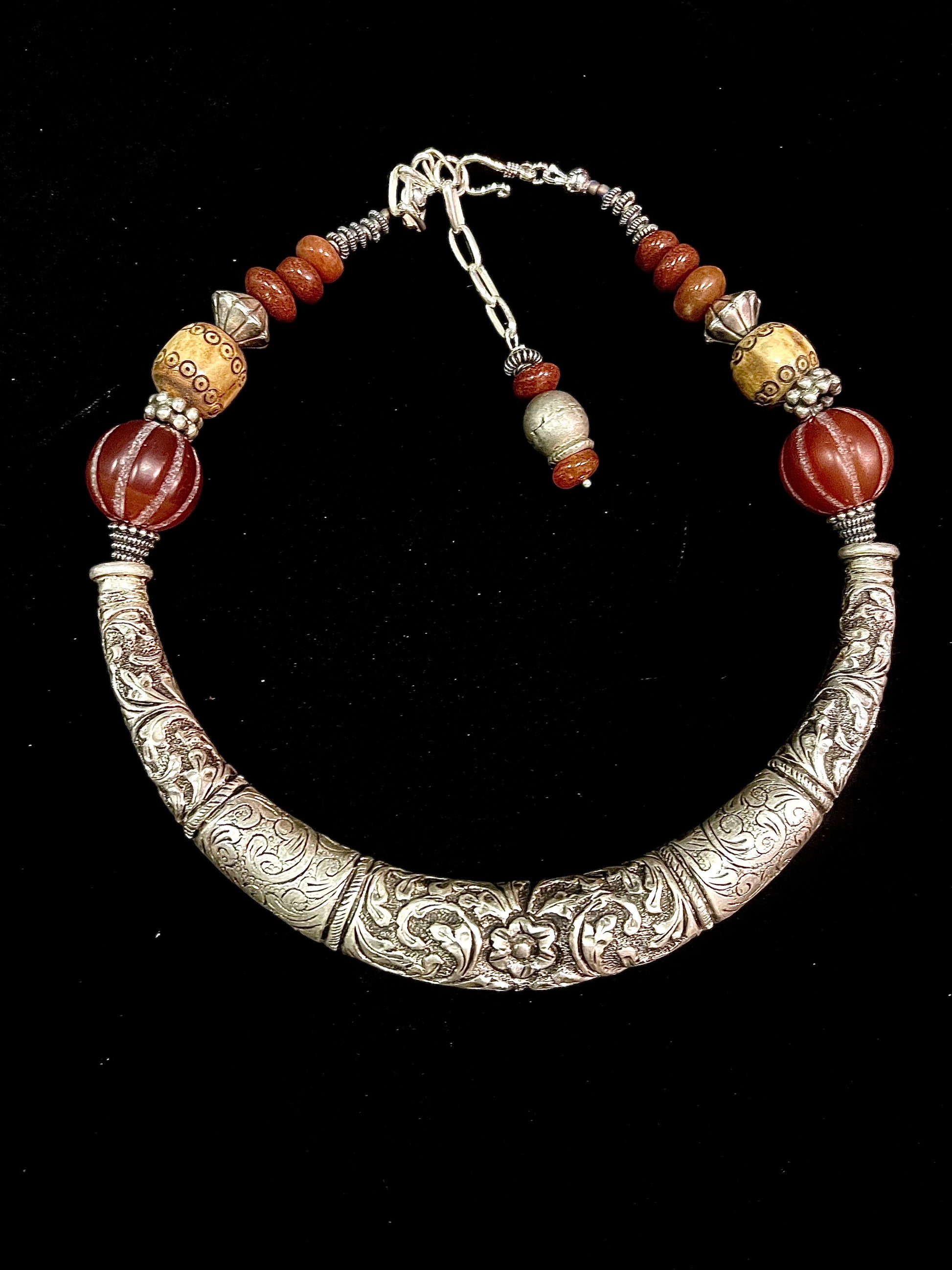 Silver torque necklace from Rajasthan India with Agates and silver beads