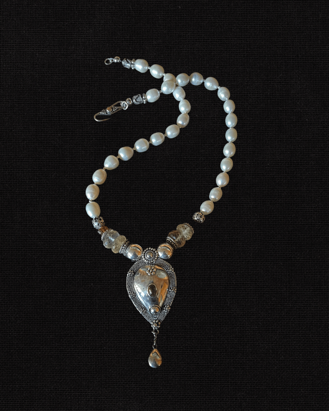 Sterling silver Bali pendant with citrine inset, strung with Freshwater pearls, citrine and silver beads.