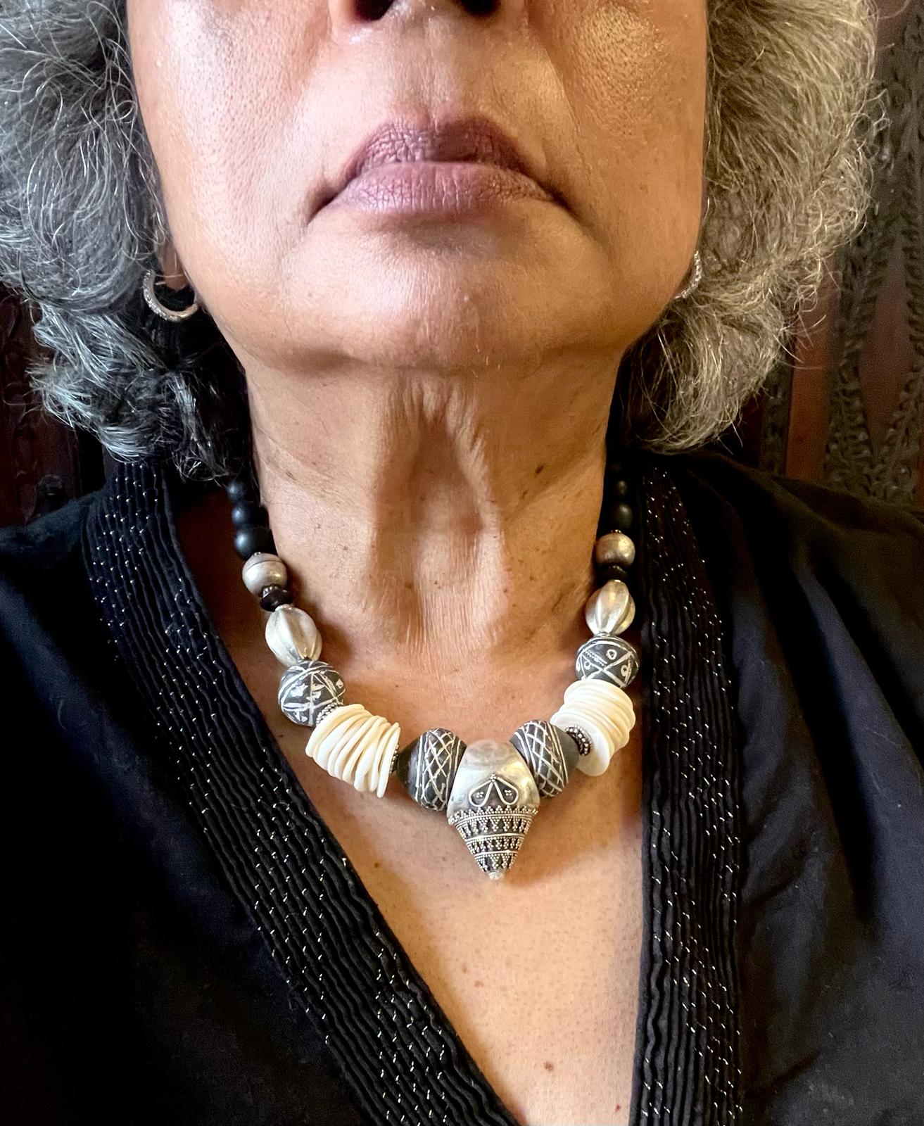 Sterling silver ring repurposed as the central pendant - strung with mother of pearl shell discs, Mali clay beads and silver beads