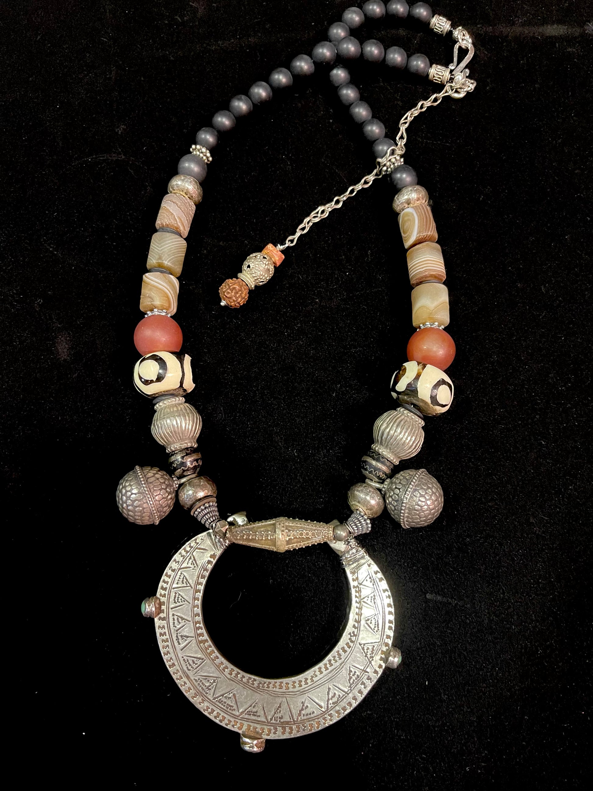Antique silver pendant - probably from Baluchistan - perhaps a bangle -with little turquoise studs on the edges - strung with banded agates, carnelian and African dyed horn beads . The 2 silver pendants on either side of the main pendant are antique Borla pendants ( forehead ornaments) from gujarat/rajasthan, India.