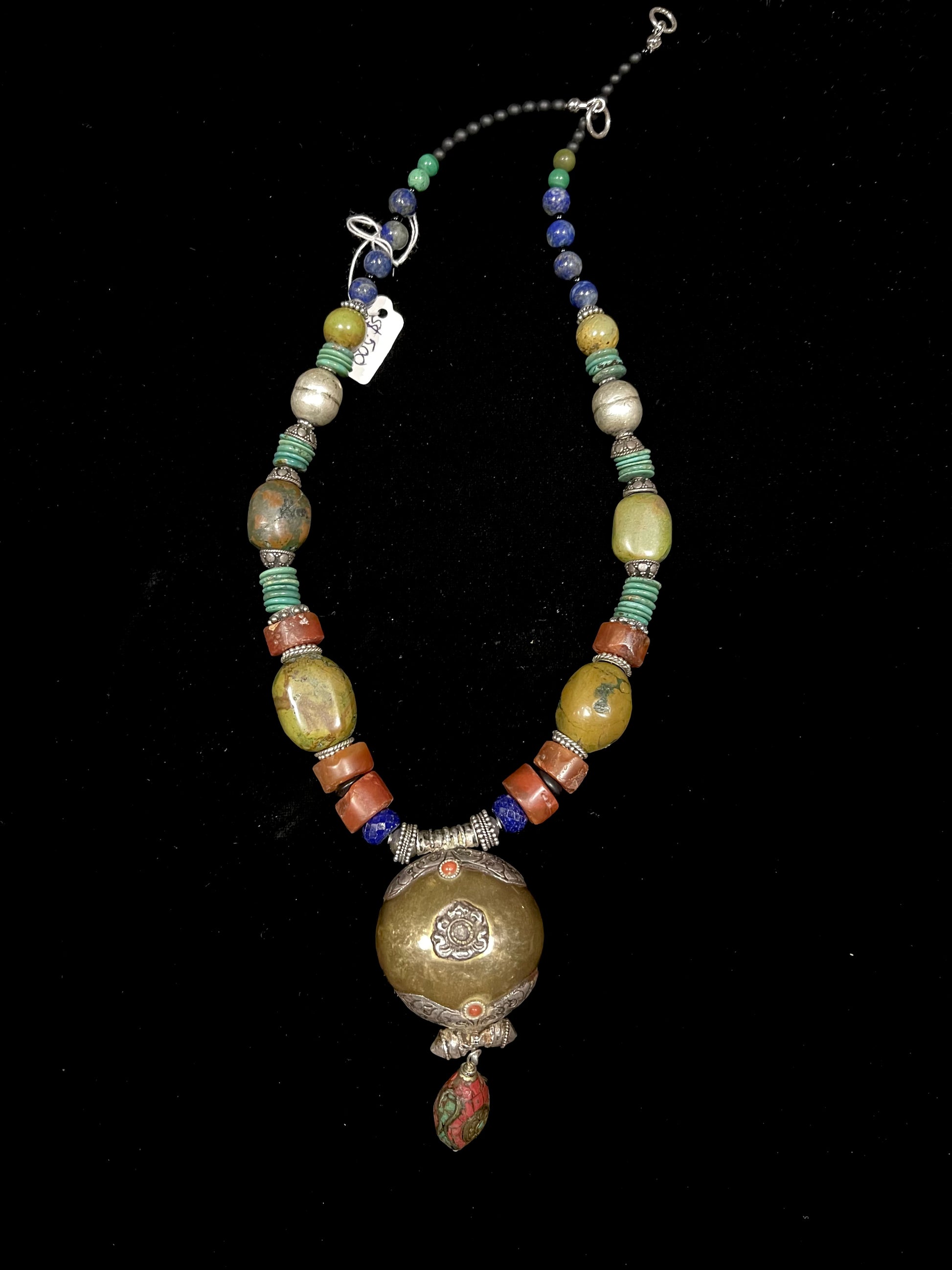 Vintage Tibetan pendant strung with turquoise and lapis lazuli and old carnelian