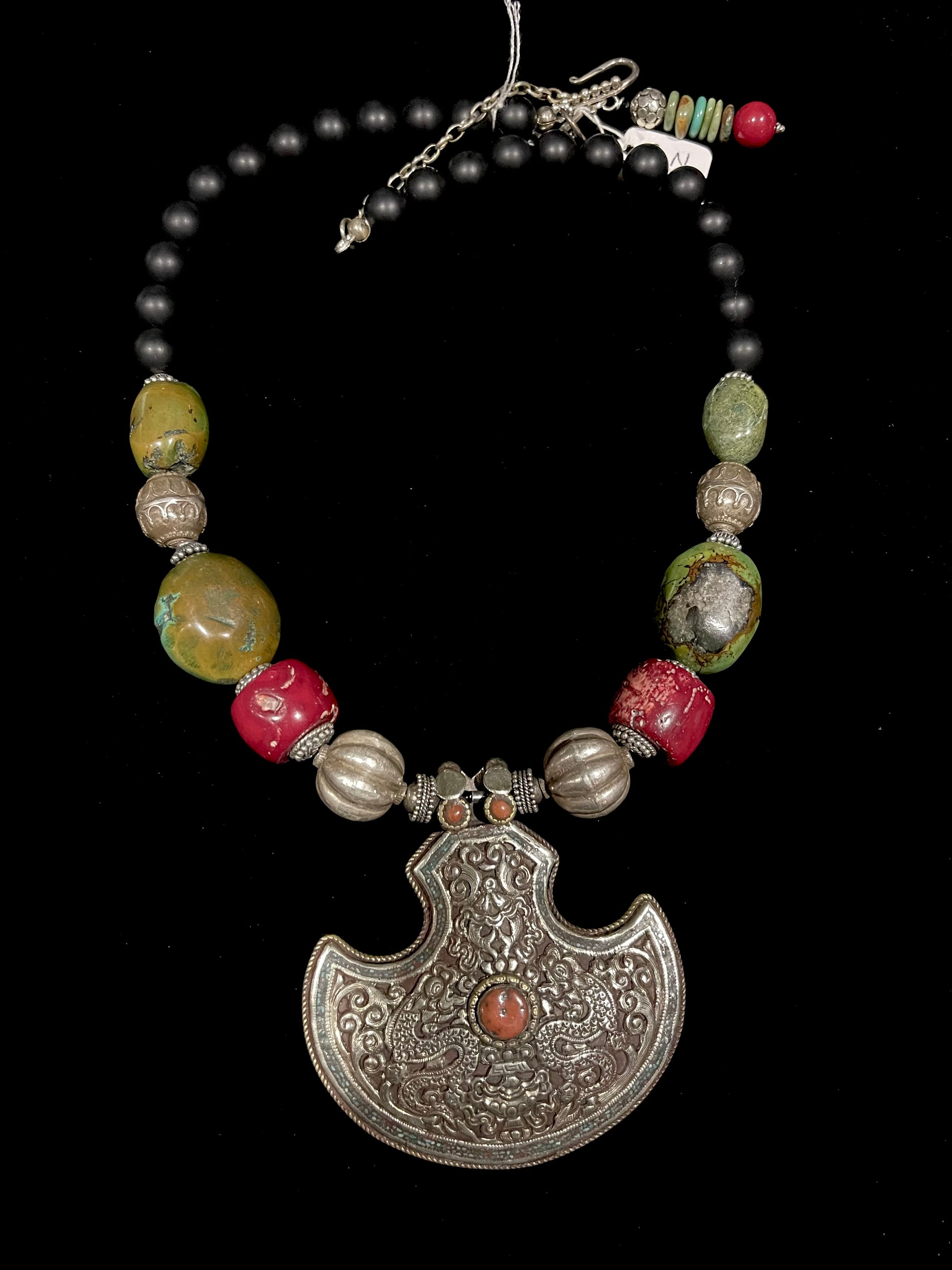 Vintage Tibetan silver pendant -strung with branch coral, Tibetan turquoise, old silver and matte black agates