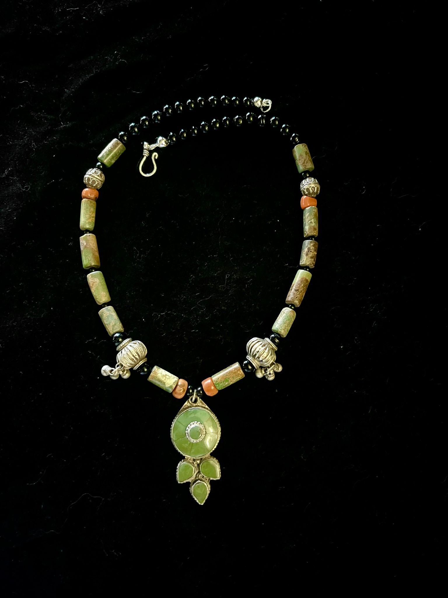 Tibetan turquoise pendant strung with old Himalayan turquoise barrel beads, old silver, coral and onyx.