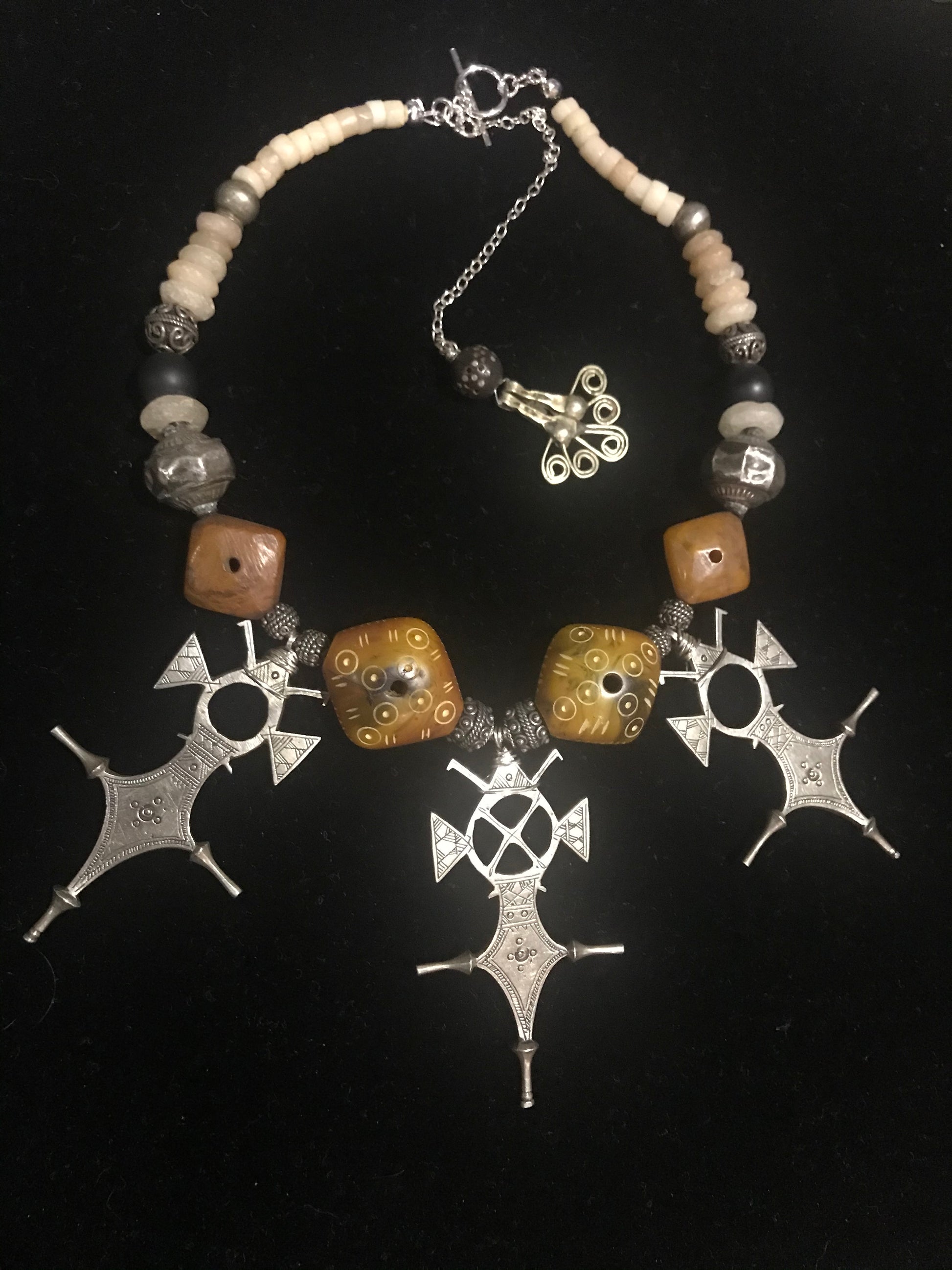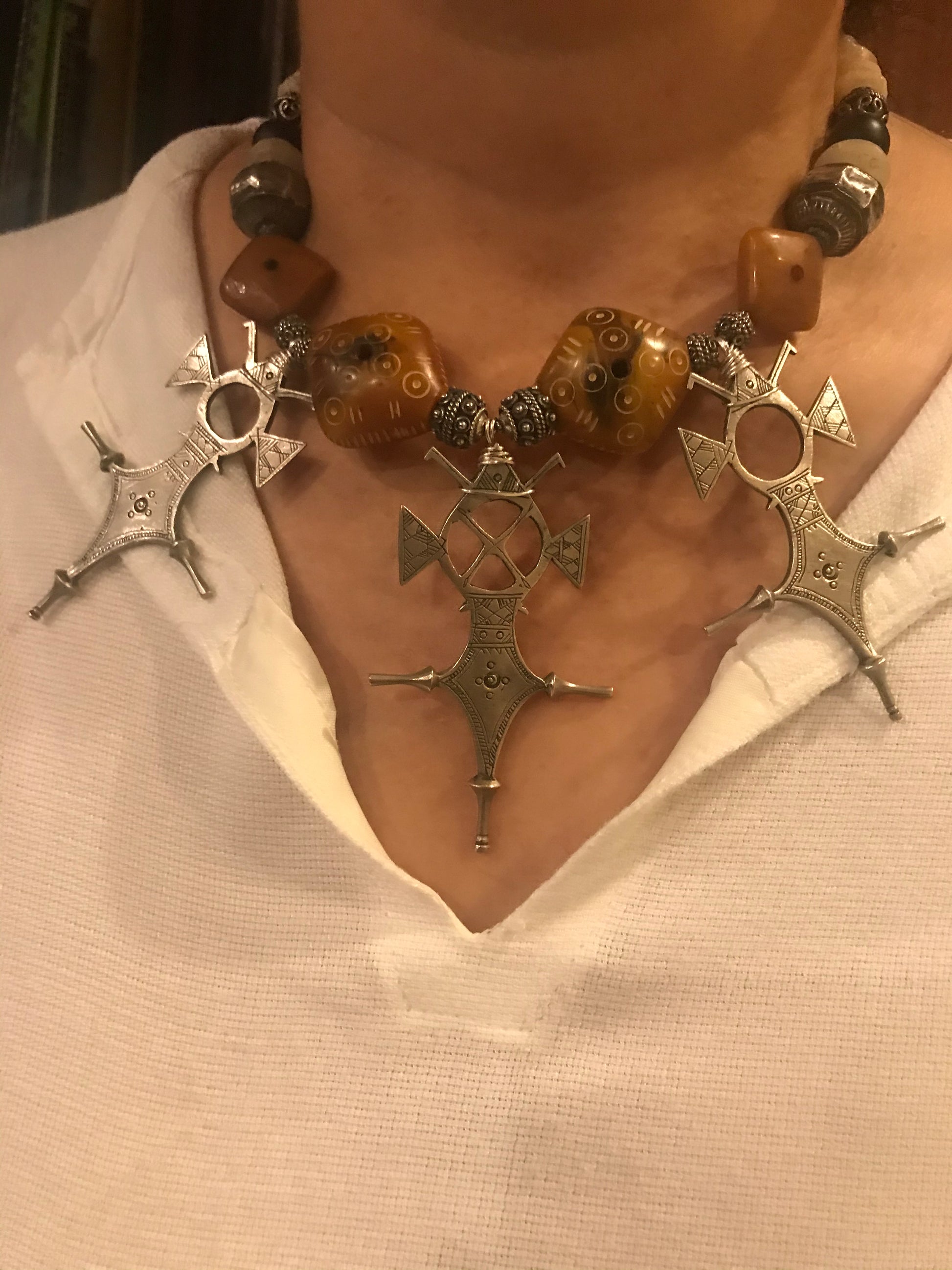 Three silver Tuareg Agadez Cross pendants, strung with carved phenolic resin beads, old silver beads and old agates