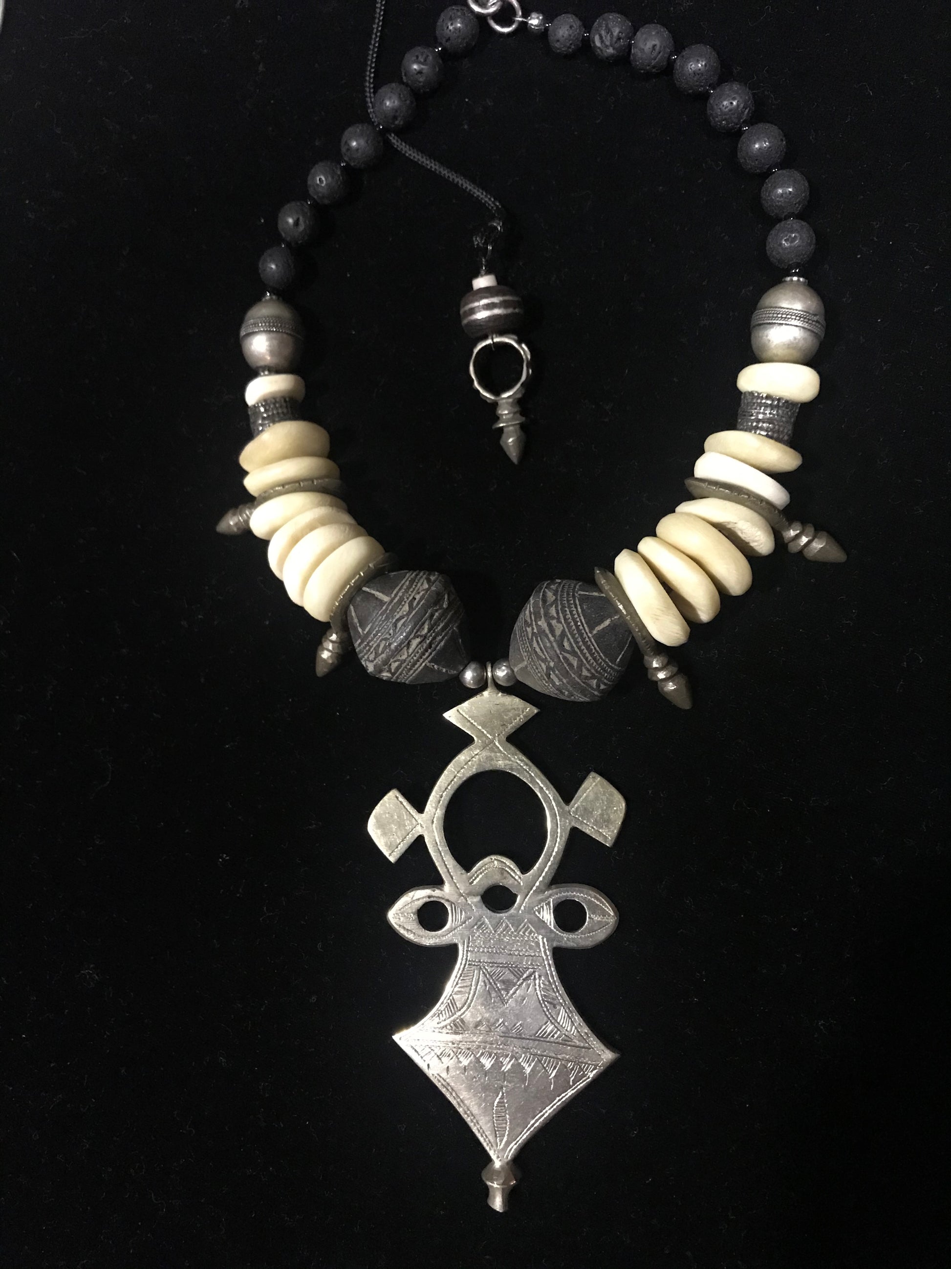 Large Vintage Tuareg Agadez cross pendant, strung with horn beads, Mali Clay whorl beads and old silver