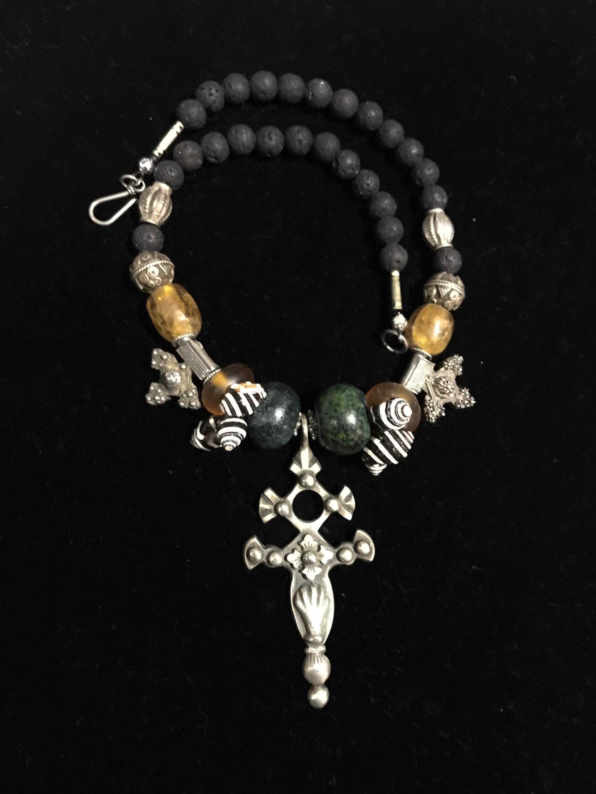 A beautiful silver Tuareg pendant strung with old glass, shells and obsidian