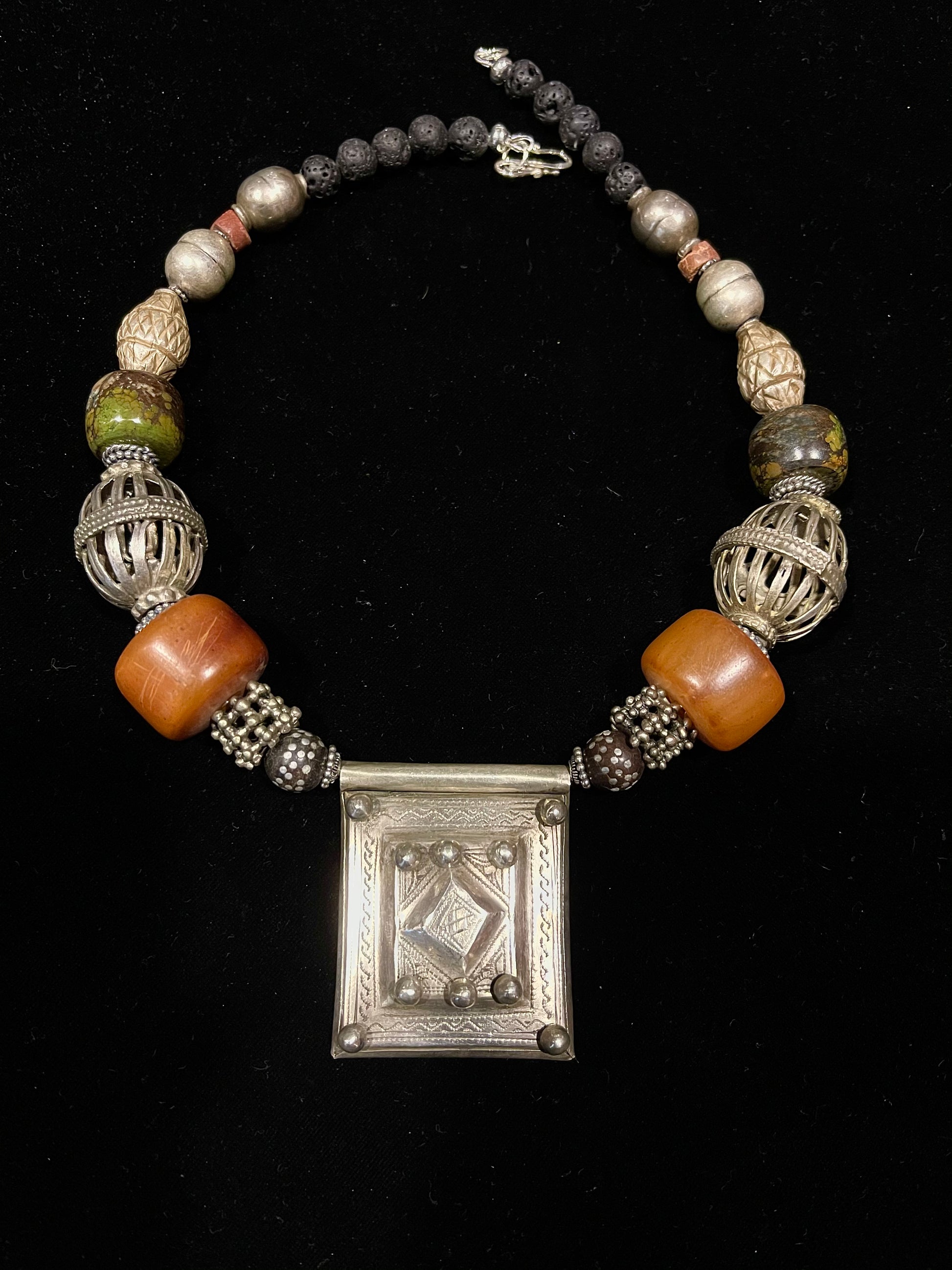 A vintage silver rectangular Tuareg pendant strung with “Yemeni caged beads, phenolic resin beads, old turquoise and silver.
