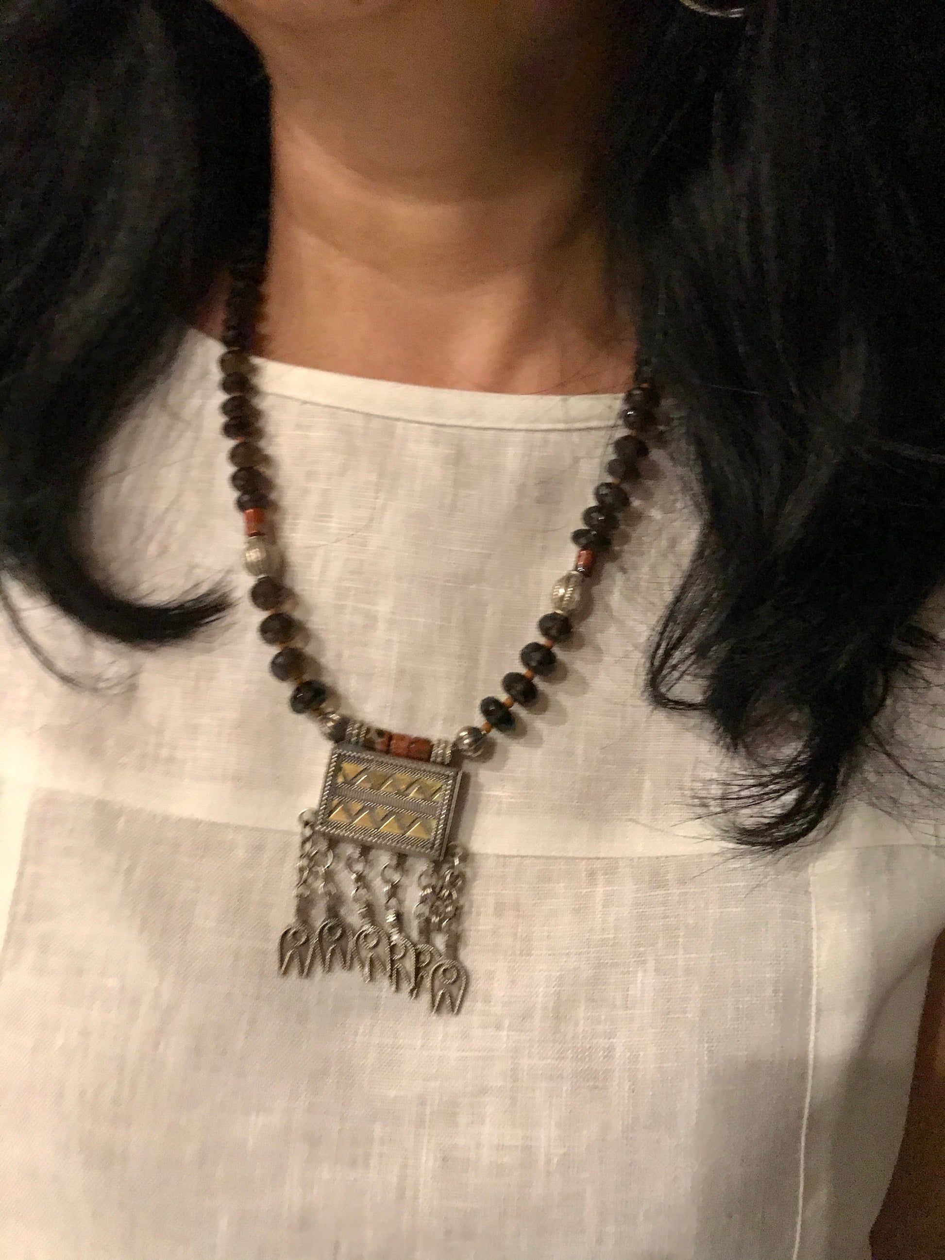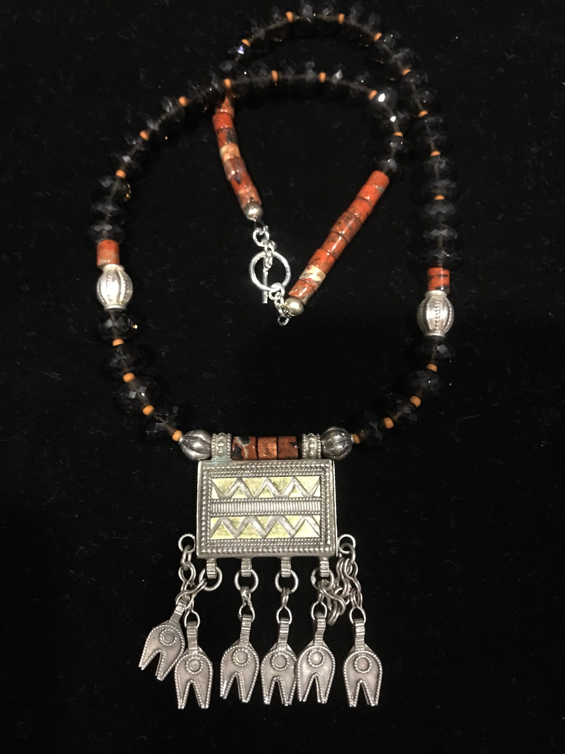 Omani silver amulet (openable) with a gold wash - strung with Smokey quartz, jasper and silver.