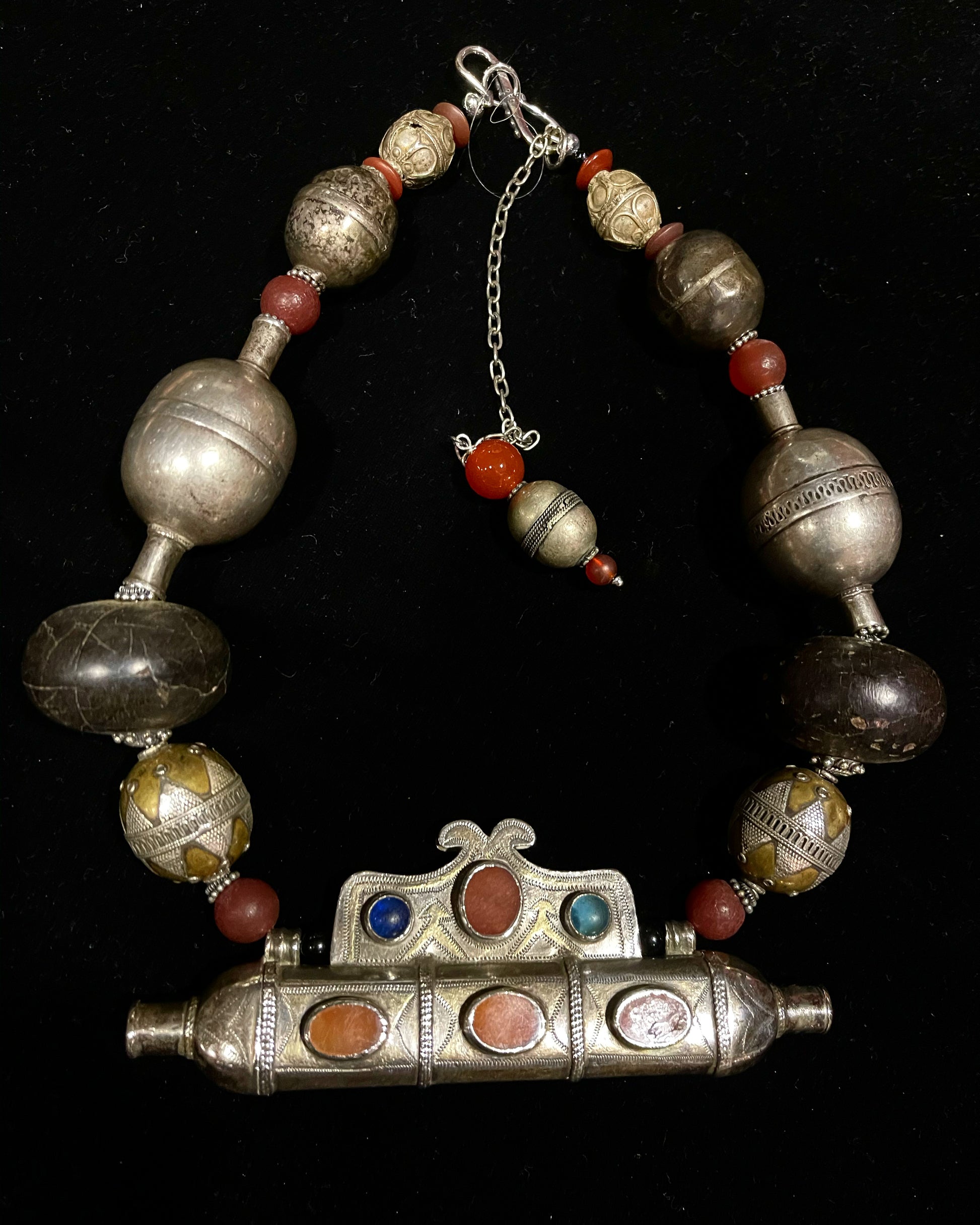 with carnelian and old glass insets, strung with Old silver turkoman beads, old phenolic amber beads and carnelian.