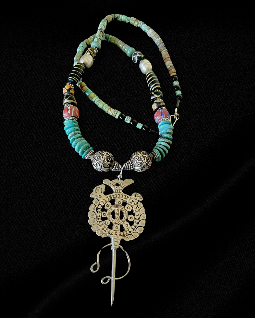Vintage Moroccan fibula string with turquoise disc beads, old silver beads and antique Venetian glass beads.