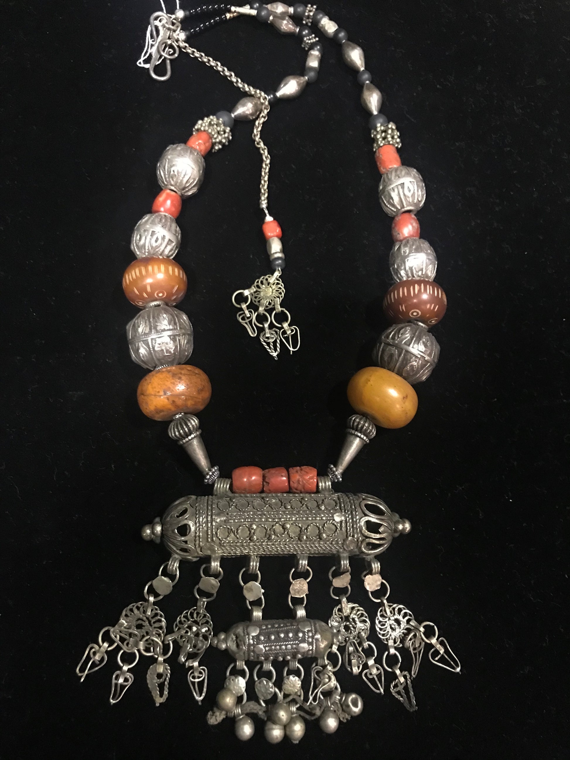 Antique silver Yemeni tawiz amulets with Mediterranean coral, phenolic resin and Yemeni silver beads.