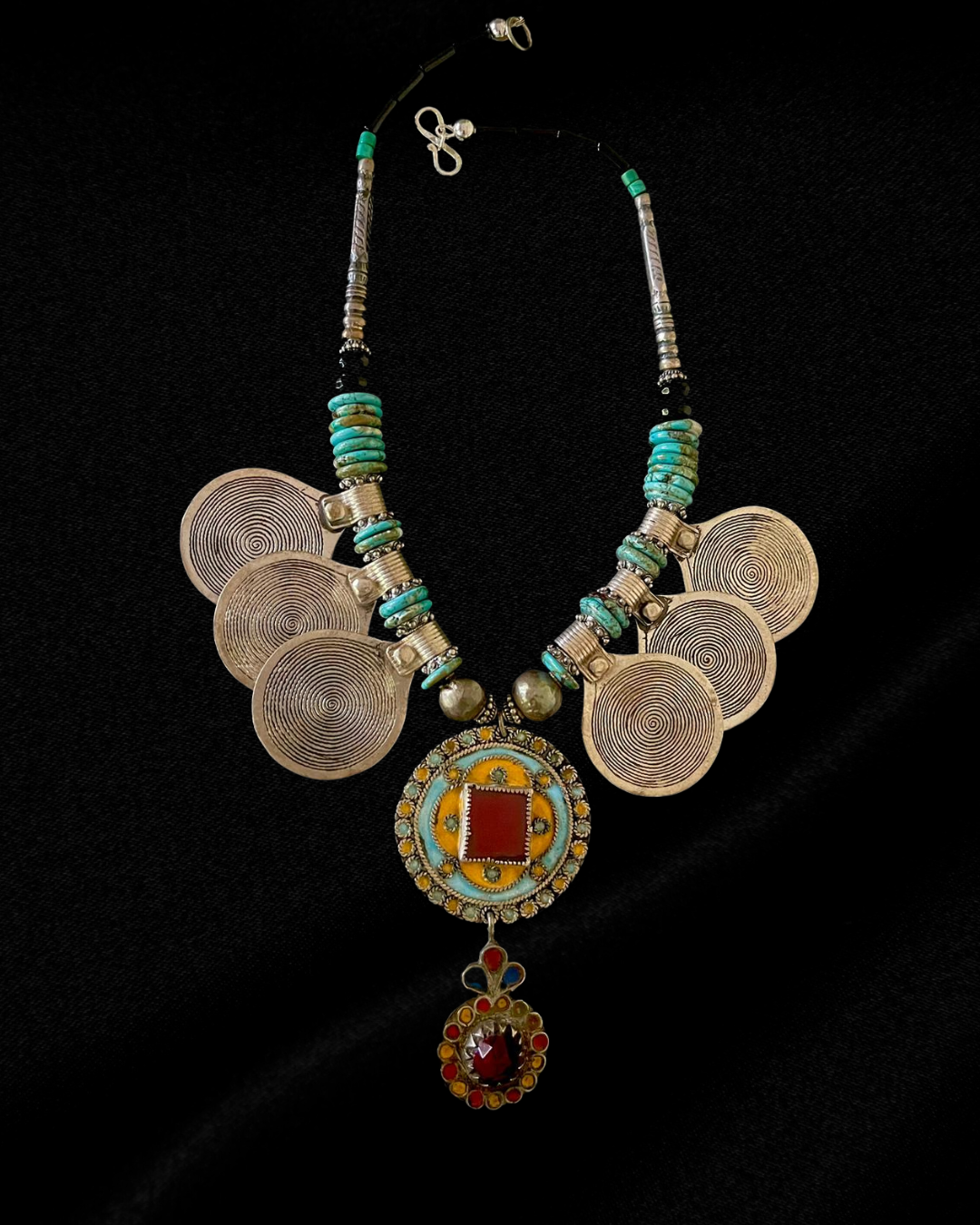 Moroccan silver eternity pendant with a central silver disc enamel pendant from Tiznit Morocco Strung with turquoise, silver and onyx.