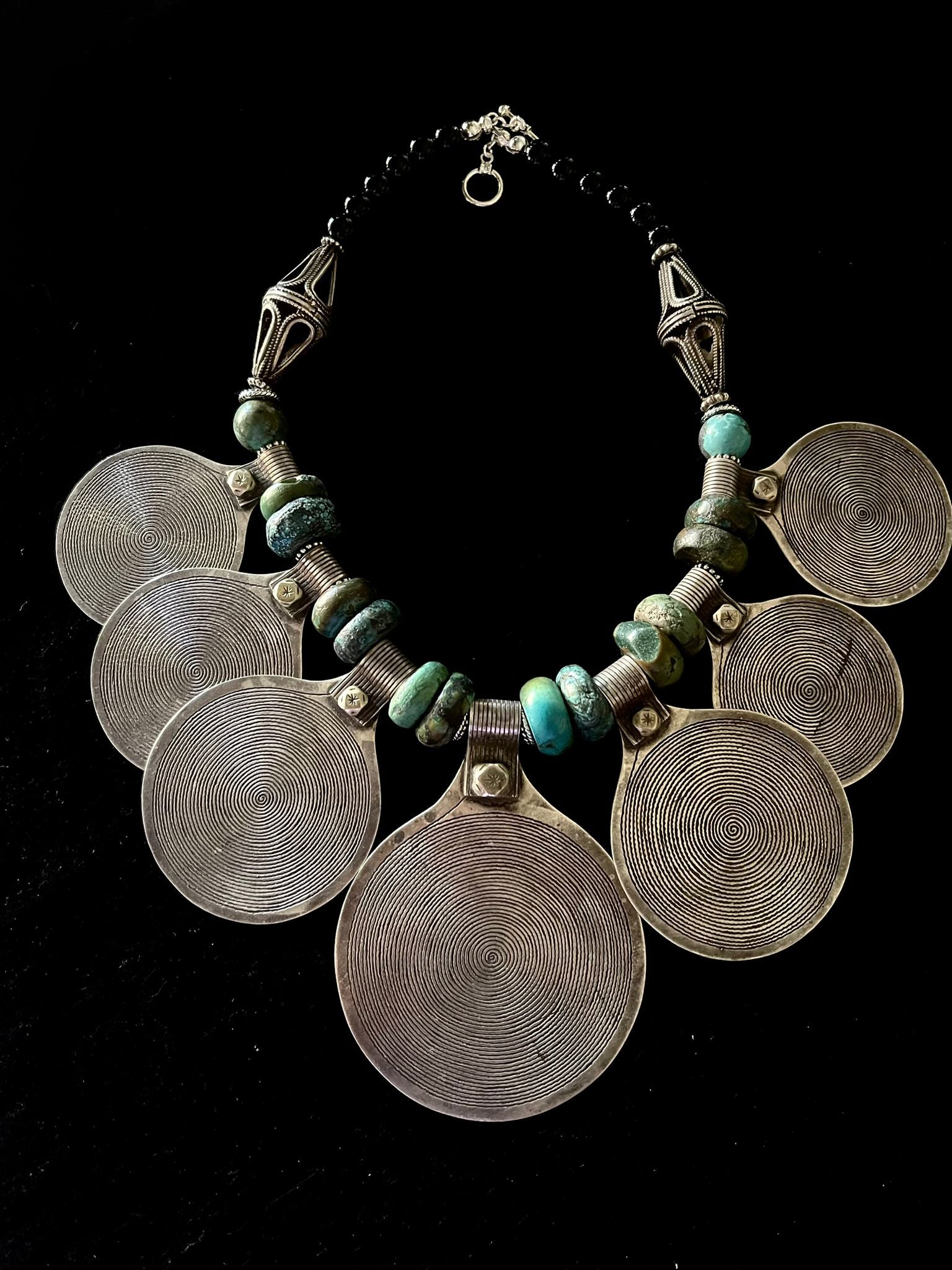 Silver Spiral discs from Morocco- with turquoise and old silver
