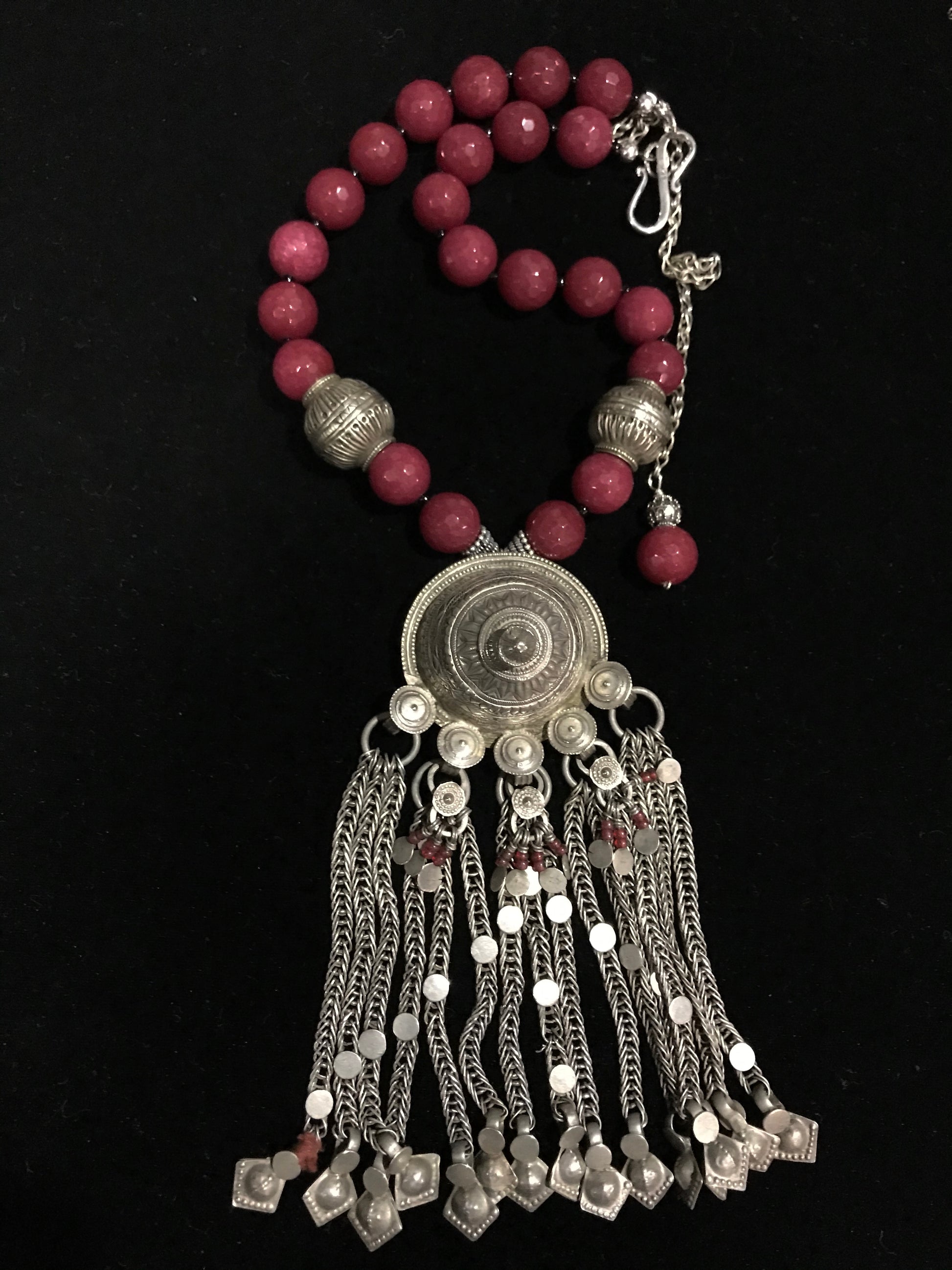 Vintage Afghan Coat button necklace with pink agates and old silver