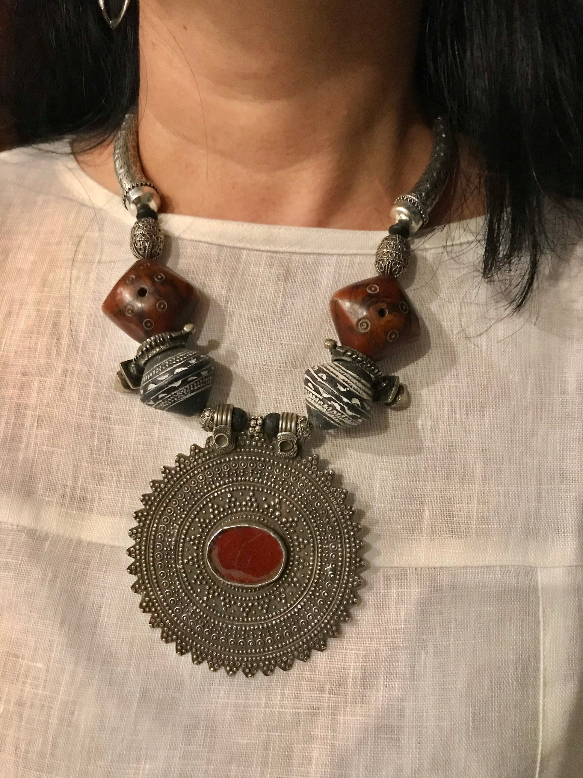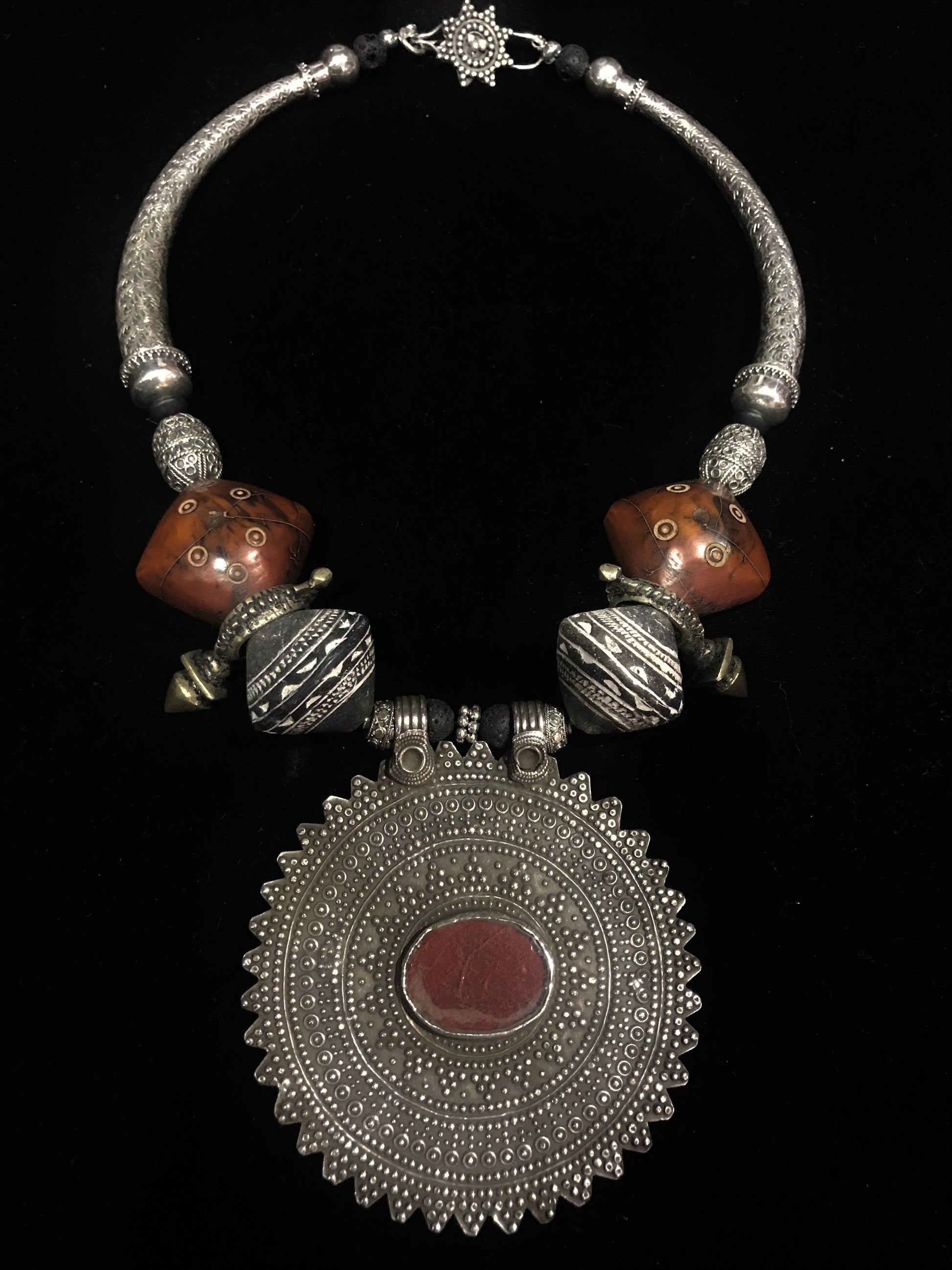 Silver Yemeni pendant with old carnelian inset. Strung with old carved phenolic resin beads, Mali clay spindle beads, silver beads and silver tubes