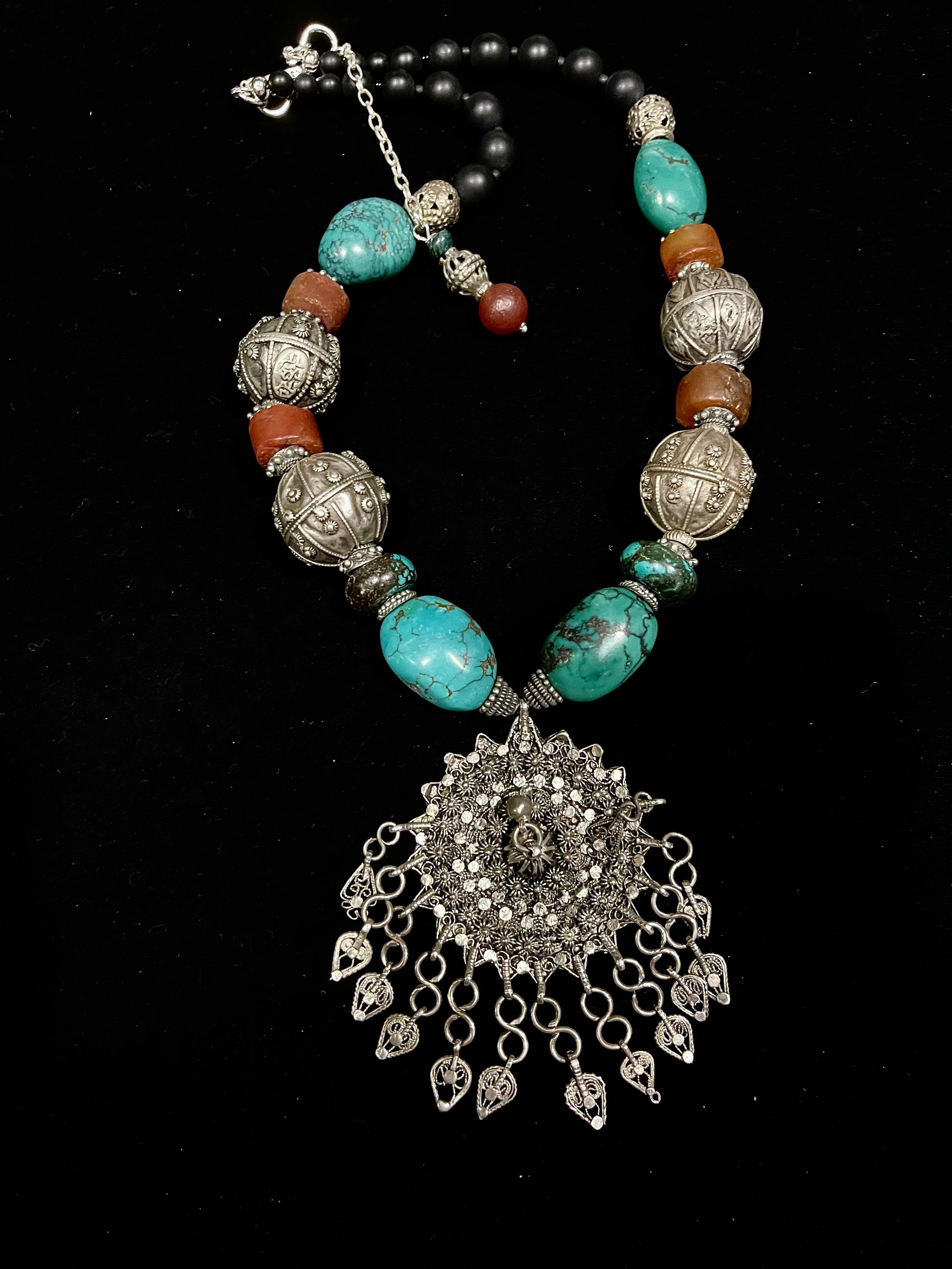 Antique silver pendant from Yemen - strung with turquoise, carnelian and antique silver Yemeni beads.